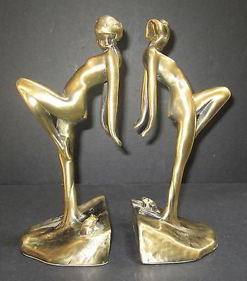 Frankart Nymph with Frog Bookends Art Deco in Brass 10" Tall metal a pair USA