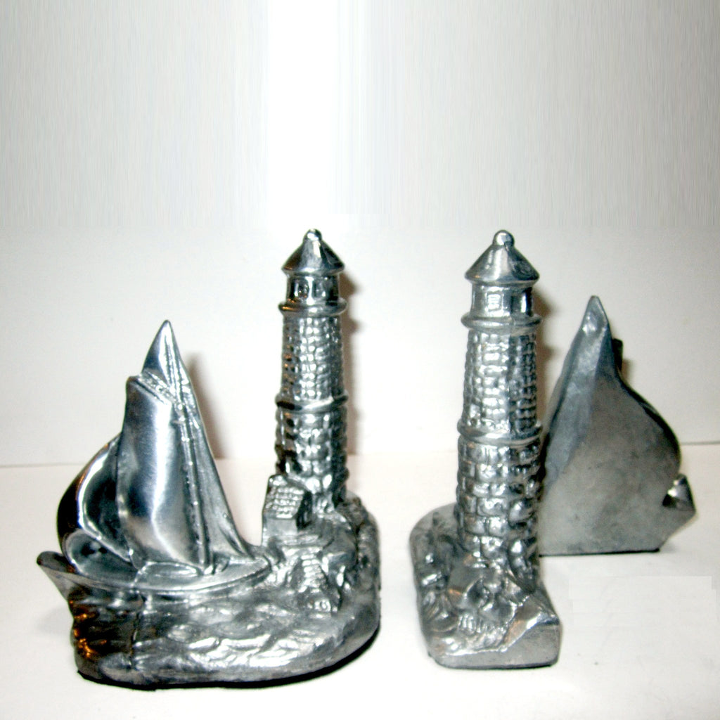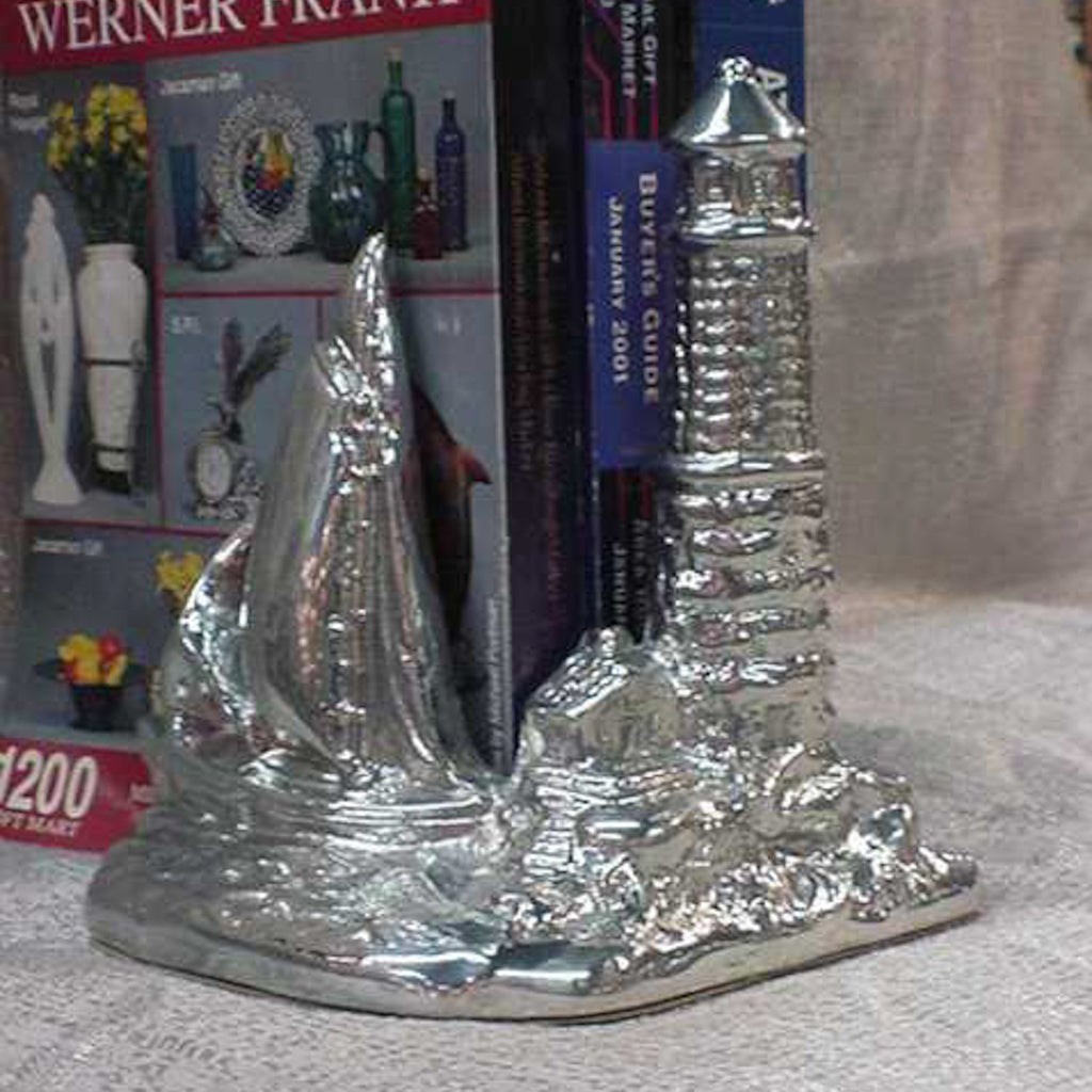 A very unusual pair of Lighthouse and Sailboat Ship Bookends in highly polished aluminum with heavy feltboard on the base. We have never seen a pair that works so unusually- these are "L" shaped, so wrap around the side and front of the books. The bookends are the same exact shape but when wrapped the left and right sides show a different design. These are new old stock from an old factory in Brooklyn NY. Sold by the pair. Each is 6" tall (15 cm), 5" wide (12.7 cm) 5" deep (12.7 cm).