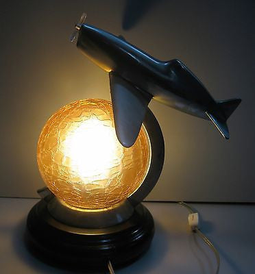 WWII Style Fighter Airplane Art Deco Lamp with a Crackled Glass Globe- Aluminum