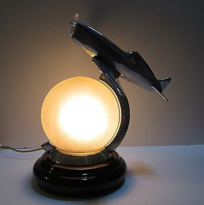 WWII Style Fighter Airplane Art Deco Lamp with a Crackled Glass Globe- Aluminum